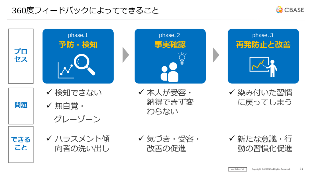 にあります。ハラスメント対策は、守りの施策であると同時に、管理職の関わり方や組織の対話の質を高める機会です。360度フィードバックを活用して人材育成や組織開発につなげるケースが増えています。