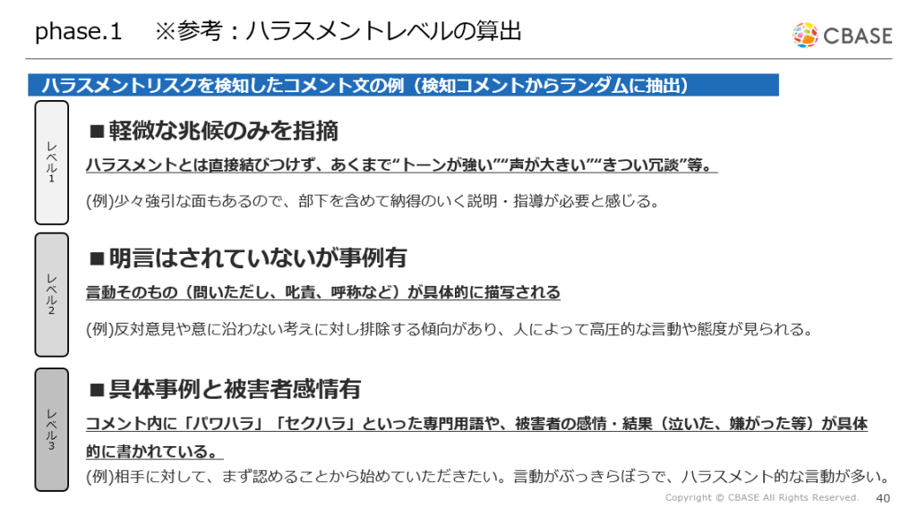 セミナーでは、記入されたフリーコメントからハラスメント傾向を可視化する「AIによるコメント分析の事例」も紹介されました。対象者に寄せられたコメントをデータソースとして、回答単位で0〜3の4段階のハラスメントレベルを算出し、対象者ごとのリスクを把握する仕組みです。